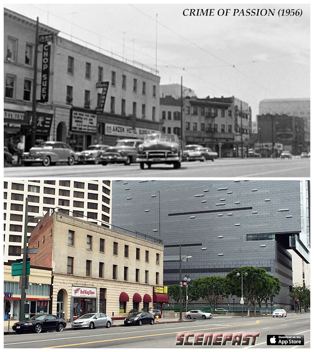 ScenePast step back into Los Angeles' film noir era for an awesome then & now from the Barbara Stanwyck film, CRIME OF PASSION (1956). Obviously a single building remains - but also notice the corresponding street lamps & antennas. The location is 1st St & North Los Angeles St. Given its proximity to LA City Hall, TV's "Dragnet" & the film, "The Crimson Kimono" also filmed here.
