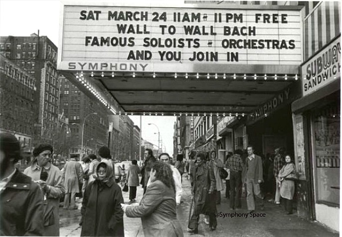 But in January 1978, something special happened. The late playwright Isaiah Sheffer and his friend, orchestral director Allan Miller, opened the padlocked doors of the Symphony Theater for Wall to Wall Bach, a free 12-hour music marathon dedicated to Johann Sebastian Bach in which the audience was invited to participate. Though the theater by this time was falling into disrepair and the neighborhood was crime- and drug-ridden, hundreds of people lined up outside to witness the event, and these two men realized that they had just found the centerpiece of the “Upper West Side Renaissance.” They leased the building, and Symphony Space was born in 1978.