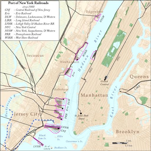 Site of former terminal across the Long Slip. Ventilation tower is part of Holland Tunnel, which contributed to the demise of terminals along the west bank of the North River . For contemporary ferry service from Pavonia, see New York Waterway. For contemporary rapid transit service from Pavonia, see Port Authority Trans-Hudson. For contemporary trolley service from Pavonia, see HBLR. The complex was built on the northern portion of landfilled Harsimus Cove. The southern part was the Pennsylvania Railroad abattoir and freight yard. A narrow slip kept that name, while another called the Long Slip was created and separated it from Hoboken Terminal. The only visible trace of the Erie's waterfront complex that remains today is part of the right of way/viaduct which carried trains from the foot of the Palisades escarpment to the waterfront. Part of it runs parallel to Boyle Plaza (the toll plaza for the Holland Tunnel) and is used for motor vehicular traffic to the Newport Section of the city.