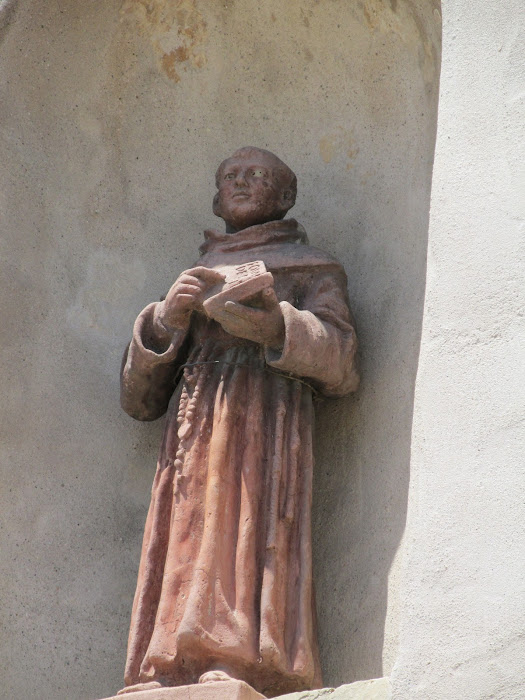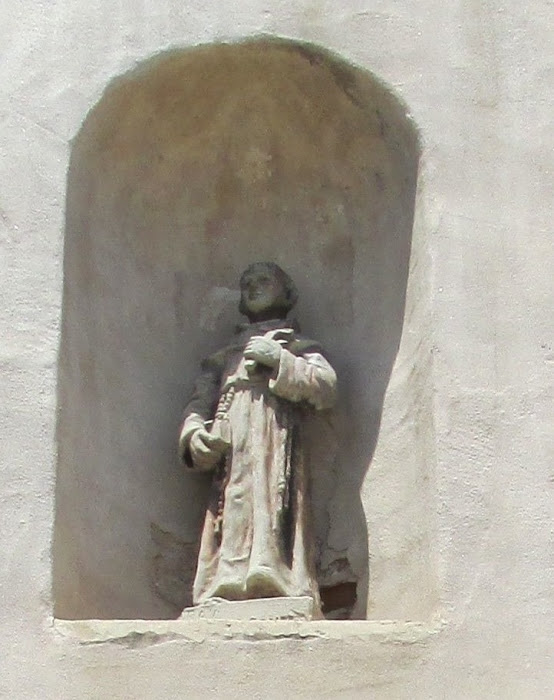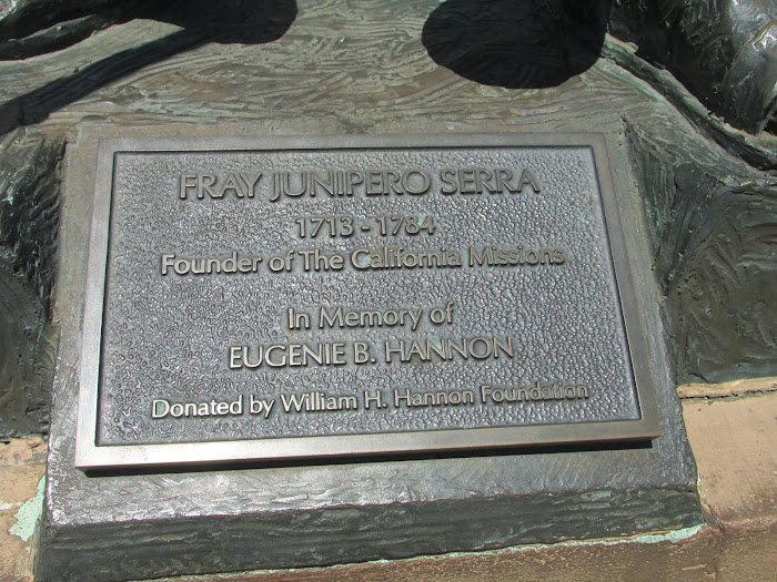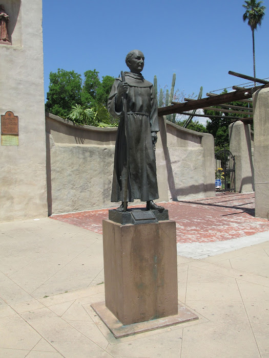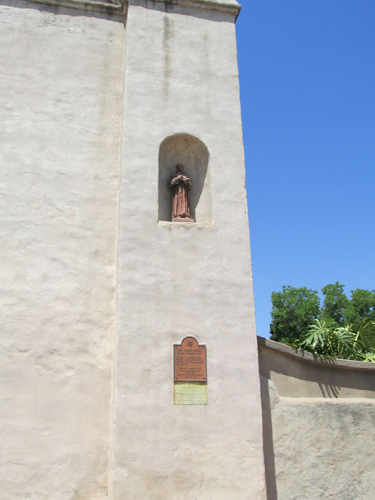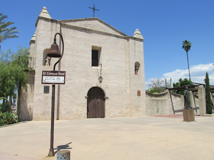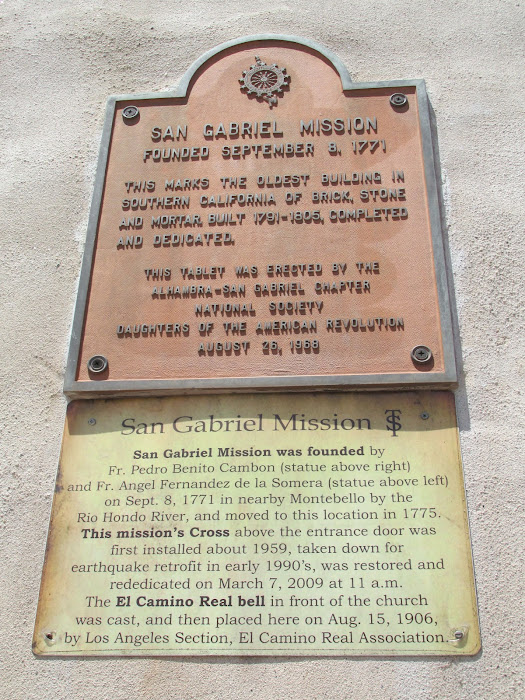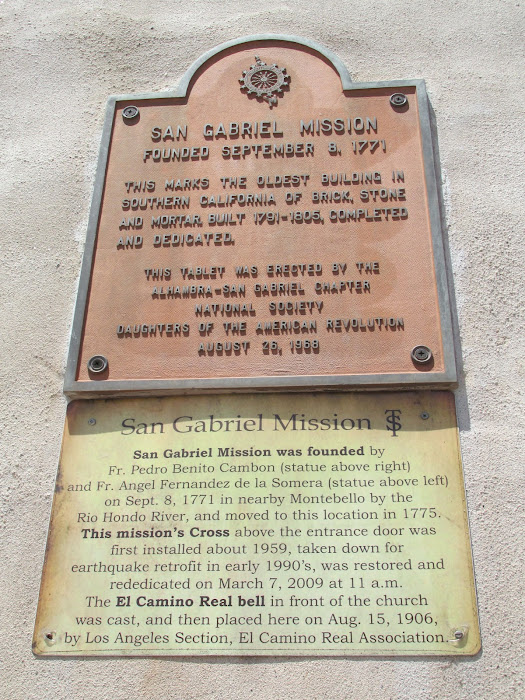 San Gabriel Mission was founded by Fr. Pedro Benito Cambon (statue above right) and Fr. Angel Fernandez de la Somera (state above left) on Sept. 8, 1771 in nearby Montebello by the Rio Hondo River, and moved to this location in 1775. This mission's Cross above the entrance door was first installed about 1959, taken down for earthquake retrofit in early 1990's, was restored and rededicated on March 7, 2009 at 11 a.m. The El Camino Real bell in front of the church was cast, and then placed here on Aug. 15, 1906, by Los Angeles Section, El Camino Real Association.