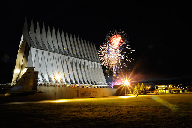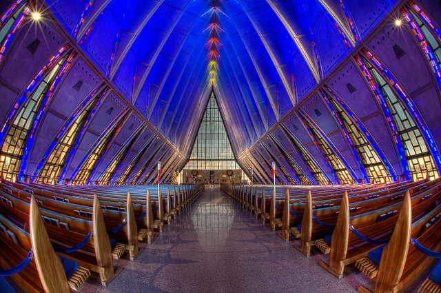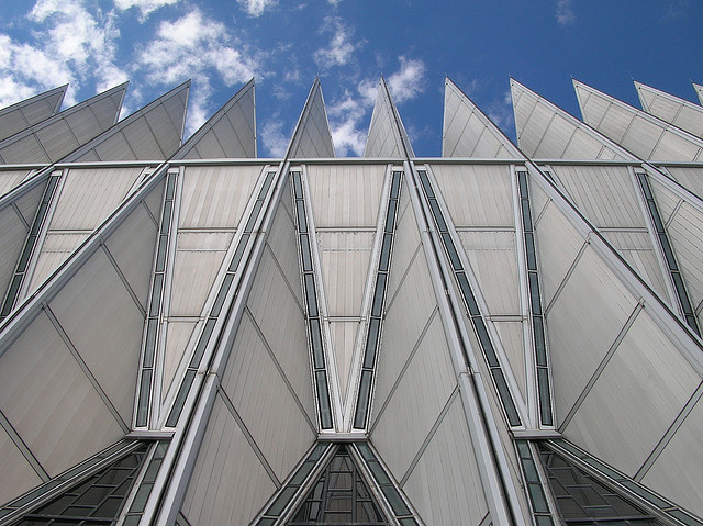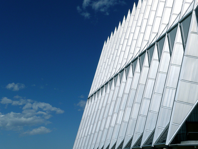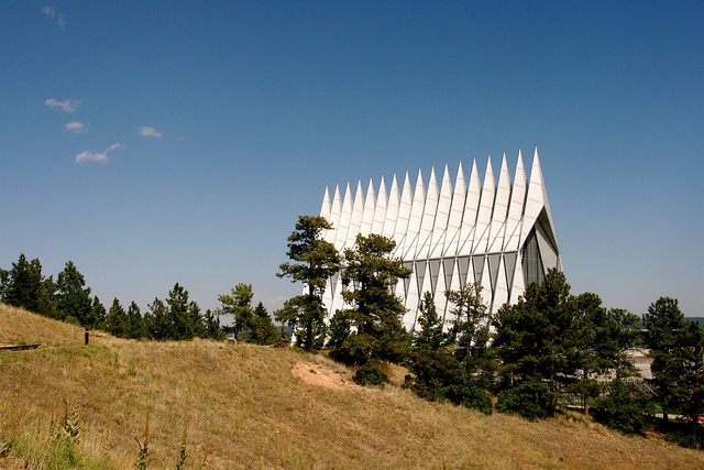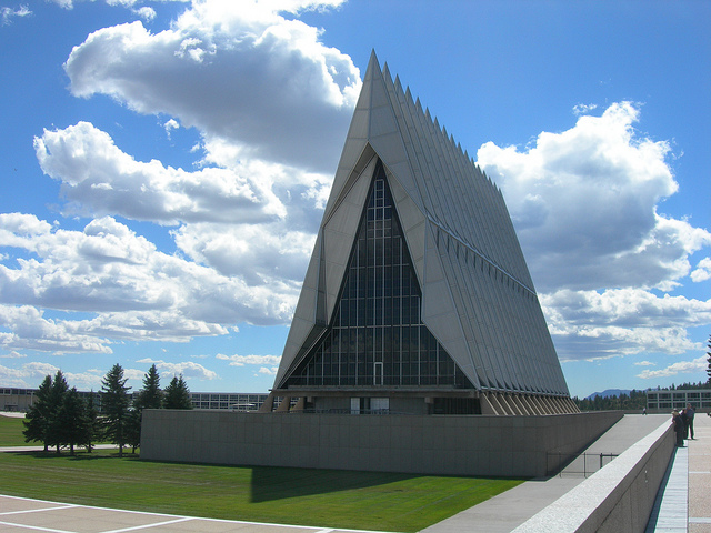 Stretching 150 feet into the chilly air outside of Colorado Springs, the Cadet Chapel appears like a massive triangular accordion penetrating the tranquil landscape and leaving thousands of visitors in awe.
