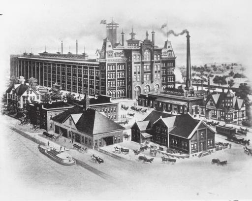 In 1862 a French immigrant, Charles L. Centlivre, established one of Fort Wayne’s most well-known industries on the west bank of the St. Joseph River, just north of where the State Street Bridge crosses the river. Known initially as the “French Brewery,” Centlivre’s enterprise, along with the Berghoff Brewery on the east side of town, made Fort Wayne a leading beer producer in the Midwest by the end of the nineteenth century. Employees of the brewery honored the founder by placing a statue of Charles Centlivre on top of the factory building. The brewery ceased operations in 1974, and the business-related buildings were subsequently razed. The 1888 Queen Anne–style Charles Centlivre residence that appears in this view could still be seen as of 2000 on Spy Run Avenue north of the intersection with State Street. A used car lot, as of 2000, occupied the site where the brewery once stood. (Photograph courtesy of Allen County-Fort Wayne Historical Society.)