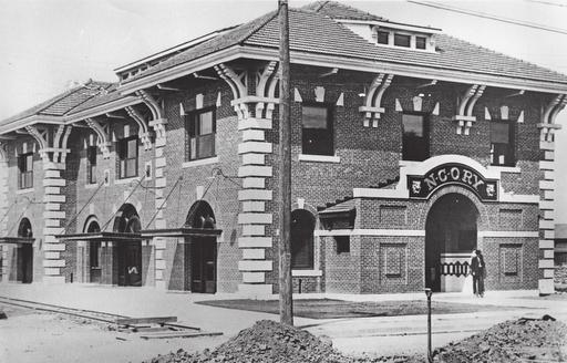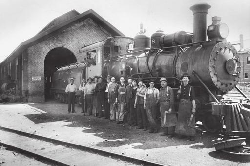Fourth Street’s proximity to the Central Pacific tracks, later the Southern Pacific, and the Virginia and Truckee Railroad tracks made it a perfect location for warehouses and manufacturers to ship supplies to and from Reno. The Nevada-California-Oregon Railway was started in 1880 to carry passengers and freight from Reno to and from northeastern California and Oregon. The Nevada-California-Oregon Railway depot (pictured) was designed by Frederic DeLongchamps in 1910. The locomotive house (pictured with men posing in front of a train), built in 1889, is the oldest remaining engine house in the state. The Nevada-California-Oregon Railway Railway was considered the longest narrow-gauge railroad, at 238 miles, when it reached Lakeview, Oregon, in 1912. In 1917, Nevada-California-Oregon Railway sold 64 miles of the line and the Reno depot to Western Pacific Railroad, who changed the tracks to standard gauge. From 1917 to 1937, the depot served as a Western Pacific passenger and freight depot. (Photographs courtesy of the Nevada Historical Society, RR-962; RR-1156.)