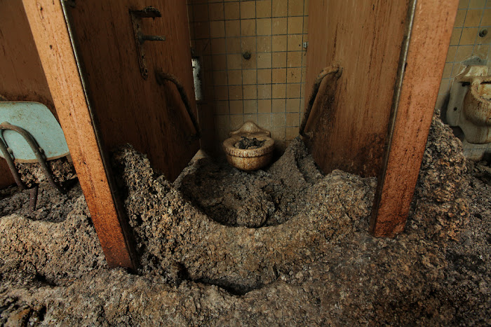 Two levels down and a world away from the top floor, a kitchen is filled with years’ worth of garbage intersected by narrow pathways. A living room, kept relatively tidy, features a sitting area with an array of chairs, including a homemade toilet. Loosely organized objects litter every surface—toiletries, clothing, hundreds of dead D batteries. Some of the belongings looked as if they hadn’t been touched for decades, but a newspaper dated to only a few weeks before confirmed my suspicion that someone was still living here.