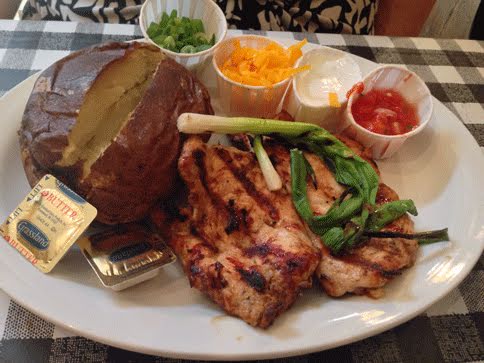 Red, orange and yellow flames denote items–such as chiles and the jerk sauce–on the menu which are spicy…or at least they are for tourists. For New Mexicans, those items are pleasantly piquant plus–hot enough to get our attention, but not so piquant that they water our eyes. One of the most surprising entrees on Cowgirl’s spicy-hot scale is the Jerk Chicken Platter, two char-grilled chicken breasts marinated in a spicy-hot Jamaican Jerk BBQ sauce and served with rice and beans (the accommodating wait staff may allow substitutions such as a loaded (chives, shredded cheese, sour cream, butter and salsa) baked potato.