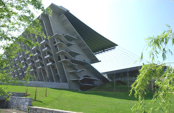 The stadium was carved from a quarry (Monte Castro) that overlooks the city of Braga. Stands run only along both sides of the pitch. Behind the goal at one end are the rock walls of the quarry and at the other is an open view over the city sprawling in the distance. Each stand is covered with a canopy-style roof, and both are connected to each other across the pitch by dozens of steel strings, a design inspired by ancient South American Inca bridges. Once inside the stadium, moving from one stand to the other is done through a 5,000 sq.m plaza under the pitch. The enormous rock moving process contributed heavily to the final €83.1 million cost, the fourth most expensive of the ten new stadia built for Euro 2004, after Estádio da Luz (capacity: 65,400) and Estádio Josí© Alvalade (capacity: 50,080), both in Lisbon, and Estádio do Dragão (capacity: 50,399) in Porto. The Stadium is also UEFA approved to host the UEFA Europa League final as well as participate in the elite competition for Europe's top clubs, the UEFA Champions League.