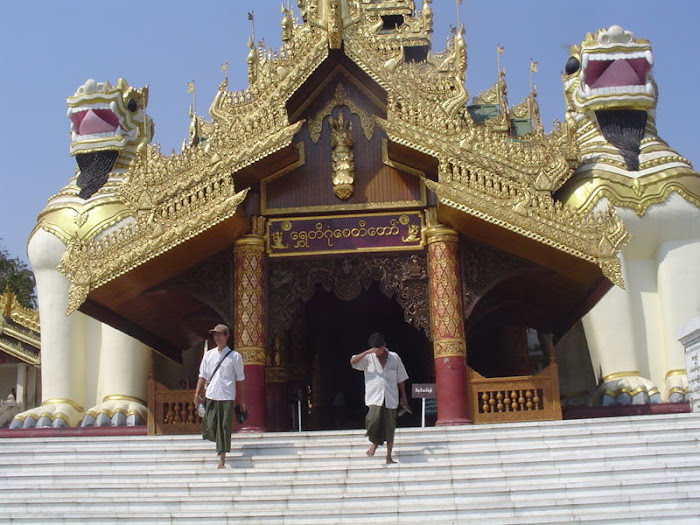 RitualsVisitors must remove their shoes before the first step at any of the entrances. The southern and eastern approaches have traditional shops with wide gradual staircases. In addition these entrances have an elevator and the infrequently used western one is equipped with escalators. Burmese walk around the stupa clockwise (let ya yit). The day of the week a person is born will determine their planetary post, eight in all as Wednesday is split in two, a.m. and p.m. They are marked by animals that represent the day, galon (garuda) for Sunday (ta nin ganway), tiger for Monday (ta nin la), lion for Tuesday (in ga), tusked elephant for Wednesday a.m.(bouddahu), tuskless elephant for Wednesday p.m. (yahu), mouse for Thursday (kyatha baday), guinea pig for Friday (thaukkya) and naga (mythical dragon/serpent) for Saturday (sanay). Each planetary post has a Buddha image and devotees offer flowers and prayer flags and pour water on the image with a prayer and a wish. At the base of the post behind the image is a guardian angel, and underneath the image can be seen the animal representing the day. The base of the stupa is octagonal and also surrounded by small shrines, eight in number for each day of the week.