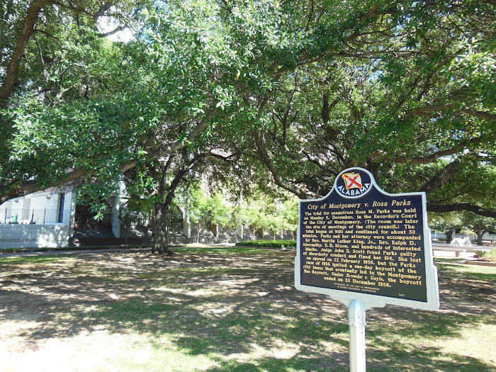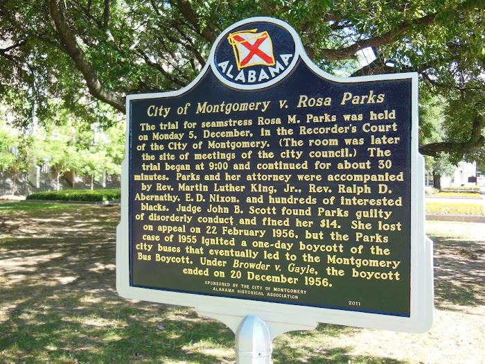 City of Montgomery v. Rosa ParksThe trial for seamstress Rosa M. Parks was held on Monday 5, December, in the Recorder’s Court of the City of Montgomery. (The room was later the site of meetings of the city council.) The trial began at 9:00 and continued for about 30 minutes. Parks and her attorney were accompanied by Rev. Martin Luther King, Jr., Rev. Ralph D. Abernathy, E. D. Nixon, and hundreds of interested blacks. Judge John B. Scott found Parks guilty of disorderly conduct and fined her $14. She lost on appeal on 22 February 1956, but the Parks case of 1955 ignited a one-day boycott of the city buses that eventually led to the Montgomery Bus Boycott. Under