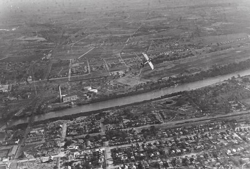 Originally Dallas’s first reservoir, Bachman Lake’s shoreline was transferred to the park department in 1930 for development as a park. The lake was created in 1903 by damming the Bachman branch of the Trinity River. This aerial view was made circa 1918 by a Love Field pilot. A biplane is seen performing a stunt in the foreground, and the Bachman water treatment plant is visible along the shore. (Courtesy of the Love Field Album and Photographs.)