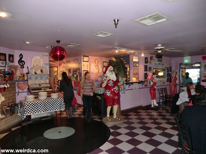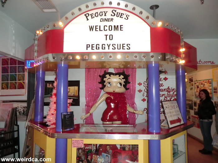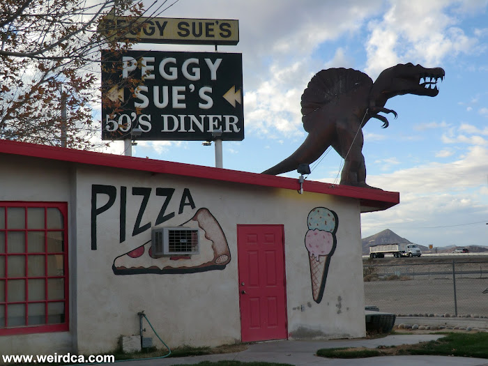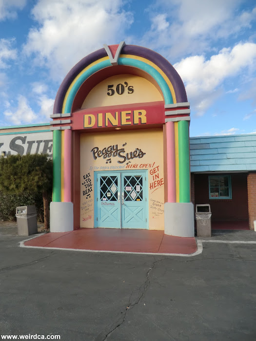If you're driving out to Las Vegas along Interstate 15, and you want a bite to eat, or to simply reminisce about Elvis, pull off at Ghost Town Road near Yermo for Peggy Sue's 50s Diner. Peggy Sue's is a very tasty diner decked out all fifties style. The original roadside diner was built in 1954, but the current owners, Peggy Sue and her husband Champ reopened it in 1987. Peggy Sue worked in the movies while Champ was formerly employed at Knott's Berry Farm. In addition to dishing out great meals, they showcase their collection of movie memorabilia.