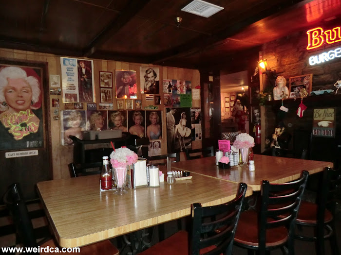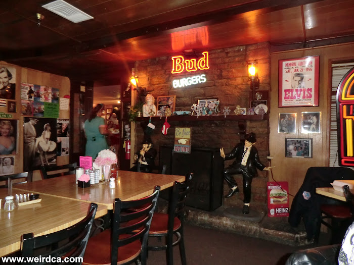 Upon entering the diner, you are greeted by Betty Boop. To your left is a gift shop with all sorts of kitschy items and to the right is the restaurant which is covered in pictures, statues, and other things from the fifties. Menu items include the King Kong Monster Burger, the Marlon Brando Mushroom Cheeseburger, the Buddy Holly Bacon Cheeseburger, and the Frankie Avalon Philly Steak Sandwich. Other menu items are named after Tina Turner, Richard Nixon, Chubby Checker, the Big Bopper, James Dean, etc.