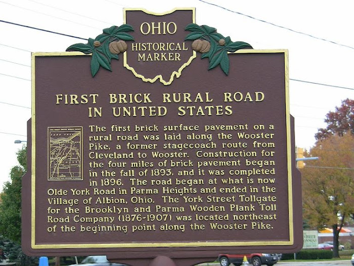 Side B:The first brick surface pavement on a rural road was laid along the Wooster Pike, a former stagecoach route from Cleveland to Wooster. Construction for the four miles of brick pavement began in the fall of 1893, and it was completed in 1896. The road began at what is now Olde York Road in Parma Heights and ended in the Village of Albion, Ohio. The York Street Tollgate for the Brooklyn and Parma Wooden Plan Toll Road Company (1876-1907) was located northeast of the beginning point along the Wooster Pike.