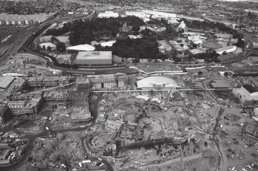 Disneyland’s parking lot took on a new look in 2000 as the new $1.4 billion Disney’s California Adventure was under construction. Guests would now park in the 10,000-car Mickey and Friends parking structure, the second largest such structure in the world, seen at the upper left. The new arts and crafts–style Grand Californian Hotel is taking shape at left center of this scene. (Courtesy of Anaheim Public Library’s Digital Anaheim Project.)