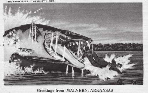 A block east of Main Street, U.S. Highway 67 motorists might have pulled up in front of the Malvern Post Office to drop a postcard in the mailbox out front. The Methodist church on the east side of the post office bought it in the 1970s and wrapped a remodeled, expanded church around the building, leaving it unrecognizable. A new post office had opened farther back down East Page Avenue. Among the postcards dropped in the box at the vintage Malvern Post Office were some like the one seen here, showing a giant fish chasing a man through a lake, “The Fish Keep You Busy Here.” Printed for local merchants, the postcard would have been among the stock at cafés and other businesses located along U.S. Highway 67. (Courtesy of Steven Hanley and Ray Hanley.)