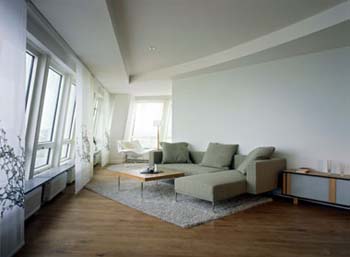 Units one and two contain 4,000 m2 (43,000 sf) of office space distributed over 10 floors, with two elevators of their own. Units three through nine contain 147 apartments, varying in size from 45 m2 (484 sf) to 190 m2 (2,042 sf), for a total of 13,500 m2 (145,125 sf) of residential space. Each residential floor accommodates one to five residences, which all have their wet spaces (kitchen, bathroom) allocated near the vertical nucleus. The apartments are served by three elevators. At the top of unit nine, on floors 53 and 54, are meeting rooms. Each of these meeting floors has two rooms, one of which can be divided.