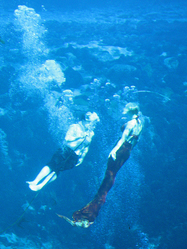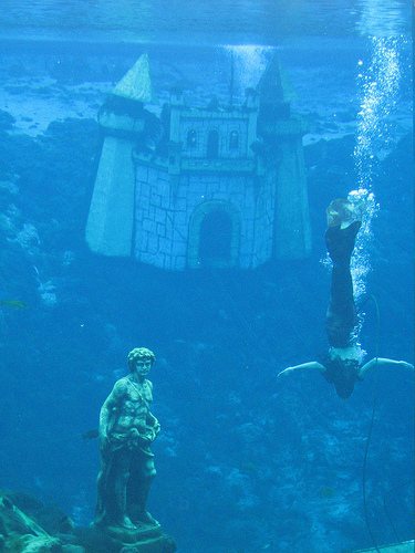 While the mermaid show is geared towards a kid audience with its reference to The Little Mermaid, I found it to be wonderfully dated in places, in a way that made me feel like I was watching one of the original shows from the 1950′s. I have to admit to being caught up in the grace and beauty of the mermaids and swimmers floating effortlessly in front of us as we sat in the darkened underground theater, as folks had been doing for 60+ years before us.