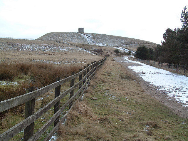 Rivington Pike is a hill summit and part of the West Pennine Moors, overlooking the village of Rivington whose boundary stretches toward Winter Hill in Lancashire. The nearest towns are Chorley and Horwich. The 'Pike' is a prominent local landmark. The name Rivington derives from the Old English hreof plus ing and tun meaning farmstead at the rough or rugged hill. An alternative is "Rowenton", an early name derived from the rowan or mountain ash trees that once grew there. Pike derives from the Old English pic, a pointed eminence