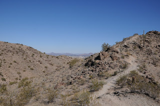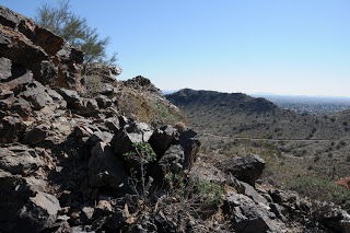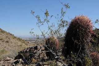 JAVELINA-RIDGELINE-BEVERLY CANYON LOOP South Mountain Park, Phoenix Seriously, this desert route had been rotting on my “C” to-do list for years---mainly because of the ugly trailhead. So I put off hiking it until this past week. Now, I wish I hadn’t been so quick to judge. The trailhead is indeed, an eyesore--plopped in the middle of a noisy industrial park. From this vantage point, the trail appears to have few redeeming qualities. None-the-less, I prepped my camera and hit the dirt. The first half-mile had me thinking this trek was closer to a “D”-lister. After that though, things began to improve. Once out of earshot of the annoying “air products” (what ever the heck that is) factory, the hike takes on a calmer tone. Nicely maintained, the Javelina Trail makes a gentle climb through classic South Mountain desert terrain. Ironwood and Palo verde trees clutter bajadas and ravines flanking the path. Abundant brittlebush shrubs and strawberry hedgehog cactuses will undoubtedly put on a colorful flower show in spring. I was surprised to see a coyote, red tail hawk, ground squirrel, woodpeckers galore and a gaggle of quail. The Ridgeline Trail junction marks the beginning of the best part of the hike. This short rollercoaster-type trail rides a knife-edge ridge bisecting Javelina and Beverly Canyons for some breezy exposure and views that stretch from Camelback Mountain to the Four Peaks. The final segment on the lower part of Beverly Canyon Trail follows a path beneath power lines and isn’t anything to write home about--unless you like viewing vandalized petroglyphs (grrrrr). Suffice to say, this loop has been moved to my “been there, done that” list with a respectable B- rating. I will go back for wildflower season.